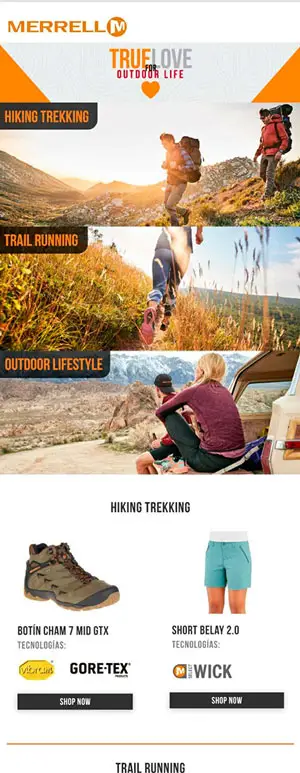 Each email prioritized clear content hierarchy, strong visual alignment with Merrell’s outdoor identity, and prominent call-to-action placement to guide users toward product discovery. The designs were structured to perform consistently across major email clients and devices while maintaining brand consistency with the broader e-commerce experience.